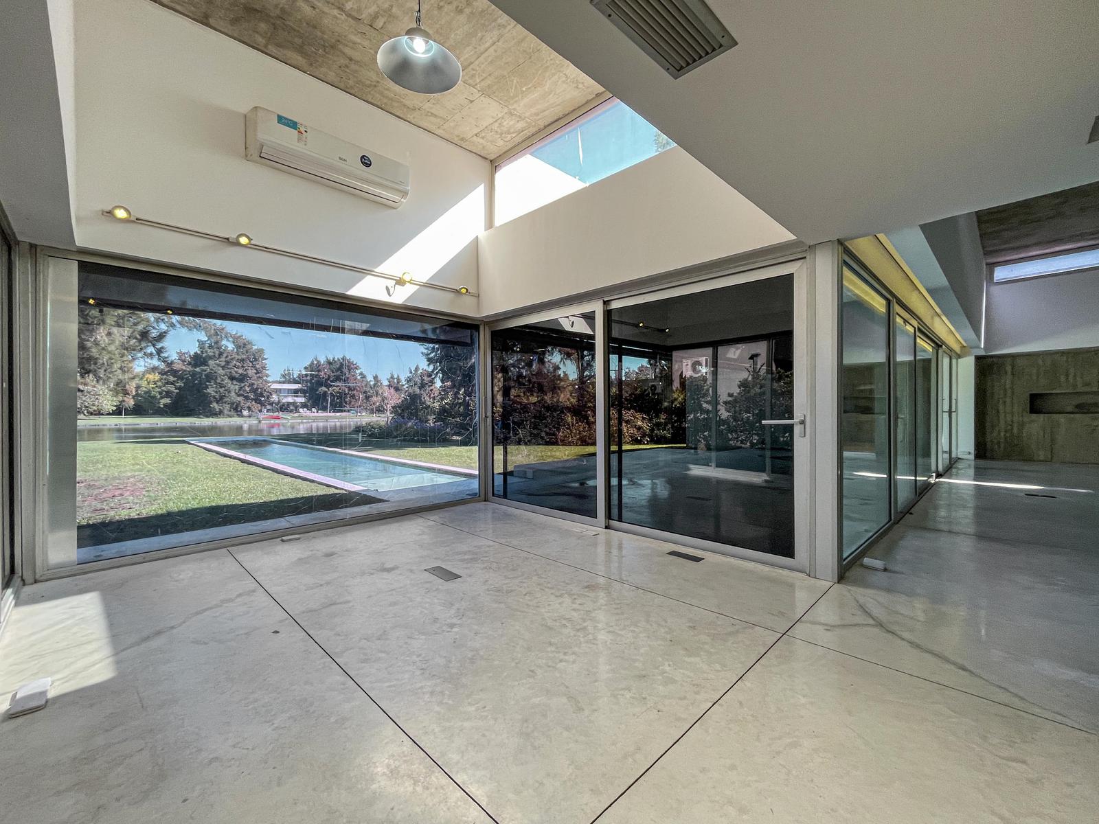 Casa desarrollada de 3 dormitorios en planta baja con ambientes amplios, techos altos y una distribución perfecta, pensada para una vivida activa y contemplando todas las necesidades de una familia grande. Doble ingreso, puerta principal de acero inoxidable hecha a medida. Área de servicio separada con lavadero independiente y tender cerrado. Amplia y moderna cocina con acceso al sector del parrillero y galería. Living comedor principal vidriado con salida a la galería techada y jardín, escritorio grande con vista al lago. 2 dormitorios amplios (cada uno con su vestidor) ambos con 1 baño compartimentado; y 1 dormitorio gigante con baño en suite más vestidor inmenso. Todos los dormitorios tienen salida a patio verde privado que hace de aire-luz. Galería con pileta y gran parque forestado con sistema de riego por aspersión. Calidad constructiva de categoría, aberturas DVH con cierre hermético, pisos de cemento alisado en toda la propiedad, sumado a las galerías y baños, porcelanato italiano en cocina, artefactos de baño y griferías de primeras marcas, baños con terminaciones en venecitas y correcto revestimiento en paredes, baño con bañera en suite, cochera cubierta para dos autos y 4 cocheras descubiertas, parrillero, pileta (3m por 23m), calefacción por loza radiante y equipo Split frio calor en dormitorio principal. Cuenta con caldera dual y termotanque de 80 litros. Refrigeración por aire Split en cada ambiente y central en living más sector de escritorio. Grupo electrógeno a gas natural y diesel. Terminaciones interiores en yeso y hormigón crudo. Estructura en hormigón visto con techos alto planos y correcta aislación. 2 tanques de agua a altura. • Ubicación: En uno de los countries más buscados por todos los usuarios finales de viviendas, sobre Av. Newbery y Alvarez Condarco; con todos los servicios a su disposición. Inigualable opción. ALDEA LAGO. A tan solo 20 minutos del centro de la ciudad de Rosario. • Proyecto: Country Aldea Lago posee una superficie de 28 hectáreas, de las cuales 8 pertenecen al lago. Sus accesos, espacios públicos y principios urbanos privilegian en todo momento la tranquilidad y los espacios verdes. Se encuentra dividido en 122 lotes los cuáles lindan en su totalidad con el lago. Cuenta con 2 canchas de tenis, Club House equipado para eventos y seguridad 24 horas. El espejo de agua fue proyectado y supervisado por especialistas en hidráulica y en ecología de medios acuáticos, con instalaciones para llenarlo en épocas de sequía y para drenar el excedente en épocas de exceso de lluvias, renovando el agua en forma natural. Se sembraron diferentes especies de peces, por lo que hoy se puede disfrutar de un variado ecosistema. • Observación: La prohibición de embarcarse en lanchas a motor en el lago. Tomarían permuta por un menor valor. Terreno de 1.468m2 con frente de 24 metros y 62 metros de fondo aproximado. Año de construcción 2012. Alquilada hasta 01/12/2026. NOTA: Las medidas informadas incluyen el 50% de los muros medianeros y el 100% de los muros interiores. Todas las fotos publicadas son propiedad intelectual de Vanzini Black S.A. No es permitida su utilización comercial. Las medidas y superficies expuestas son estimativas y a corroborar con sus respectivos planos y títulos. La publicación de este inmueble es a solo título informativo, la venta de la propiedad está supeditada a que el propietario cumplimente el trámite ante la AFIP para la obtención del Número de COTI correspondiente. La información no es contractual. Si querés saber el valor de tu propiedad, contactate con nosotros y tasamos tu propiedad en 48hs.