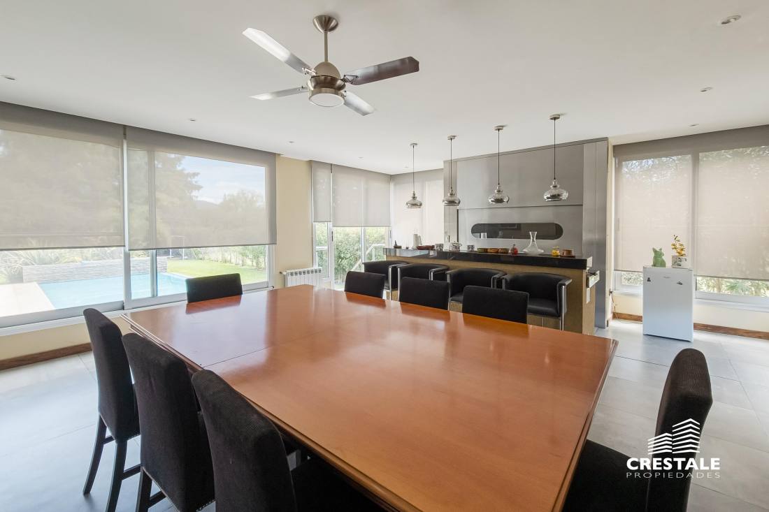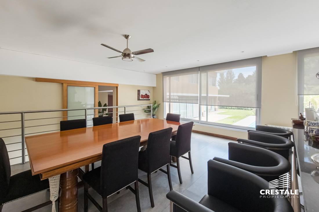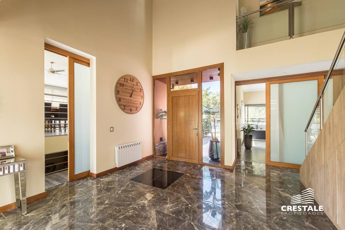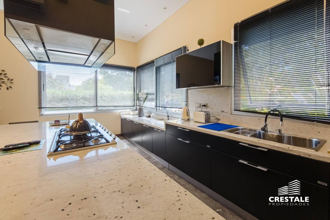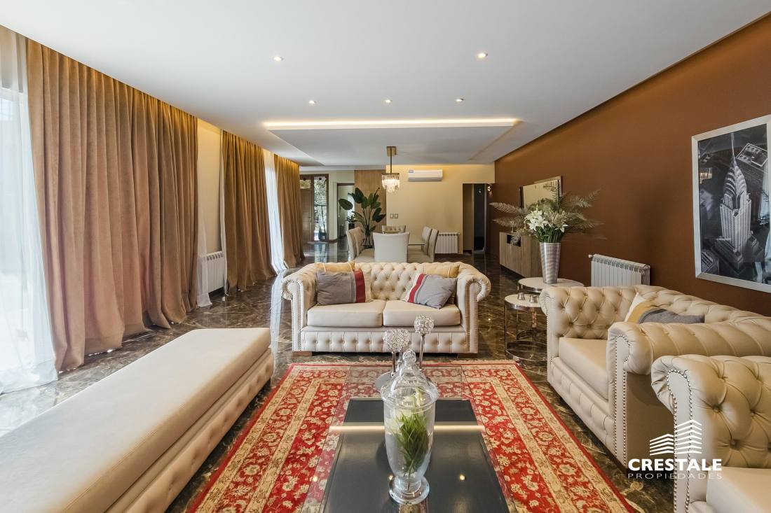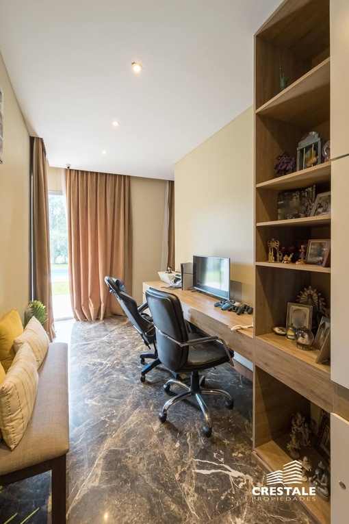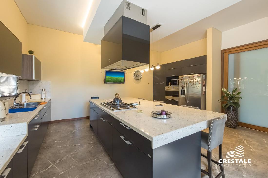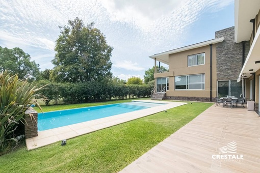 Venta / Permuta - Casa 4 dormitorios con piscina, quincho y subsuelo - Kentucky, Funes Propiedad desarrollada sobre un lote de 1200 m² (25 m de frente por 48 m de fondo), con una superficie cubierta de 458 m², distribuida en tres niveles y orientada al este, lo que favorece la luminosidad natural en los principales ambientes. En planta baja se dispone un amplio estar comedor con grandes ventanales al jardín, generando integración visual y espacial con el exterior. La cocina es independiente, equipada con isla central, mesadas y alzadas en mármol, mobiliario de primera línea Johnson y alacenas con frentes de vidrio, complementada con lavadero independiente. En este nivel también se desarrolla un dormitorio con baño completo y un escritorio, ideal para home office o uso flexible. En planta alta se encuentra la master suite de generosas dimensiones, con vestidor doble, sector íntimo adicional y baño completo con hidromasaje, doble bacha y box de ducha. Los dormitorios secundarios cuentan con excelentes dimensiones, uno de ellos en suite con vestidor, mientras que el restante es asistido por un baño completo. La propiedad incorpora un subsuelo con cava y SUM, ideal para usos recreativos, sociales o de guardado. El sector exterior cuenta con galería semicubierta, quincho independiente de grandes dimensiones con parrillero revestido en acero inoxidable, y piscina equipada con sistema de bomba y filtrado, conformando un espacio ideal para reuniones y esparcimiento. El ingreso vehicular dispone de portón automatizado de PVC, rampa de hormigón y cochera cubierta para dos vehículos. La vivienda se destaca por su calidad constructiva, amplitud y diseño funcional, con calefacción por radiadores en todos los ambientes. Residencia de alta gama en barrio privado Kentucky Club de Campo, uno de los desarrollos más exclusivos de Funes. Ubicado sobre la autopista Rosario–Córdoba, el barrio ofrece rápida conexión con Rosario y cercanía a los principales corredores de la región. Kentucky se caracteriza por su entorno natural, amplios lotes y urbanización de primer nivel, consolidado como uno de los barrios más buscados para vivienda permanente. El desarrollo cuenta con infraestructura deportiva y recreativa, incluyendo canchas de golf, tenis, fútbol y espacios verdes, además de seguridad las 24 horas y accesos controlados, brindando un entorno seguro y de calidad para la vida familiar. Código web: CHO7870382
