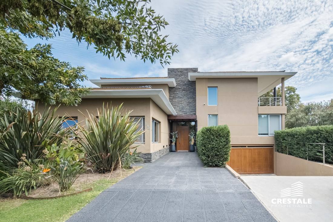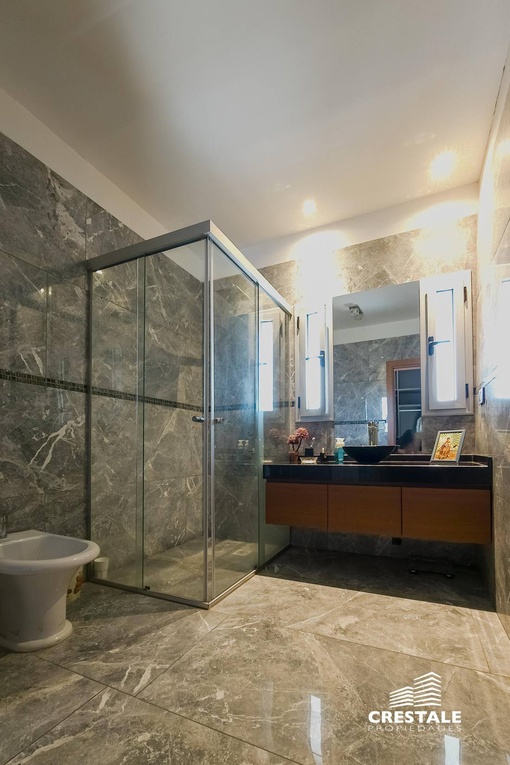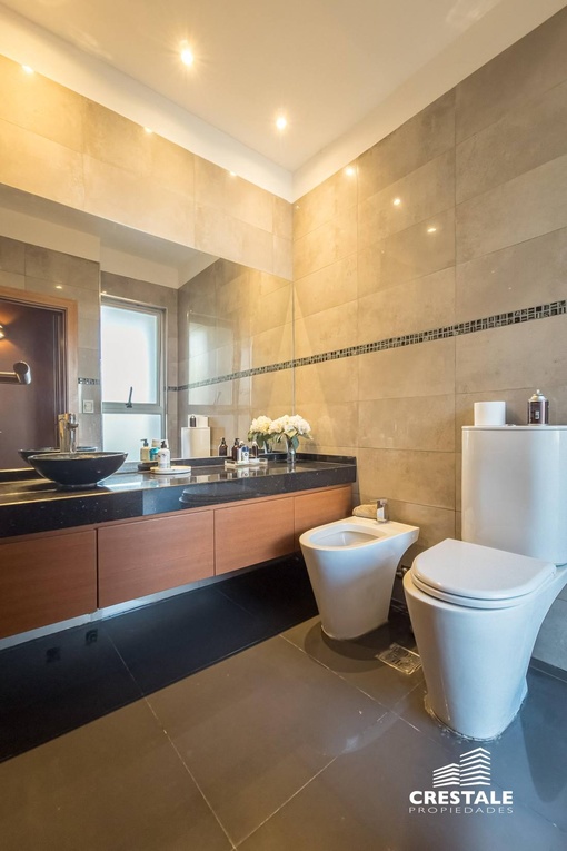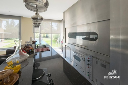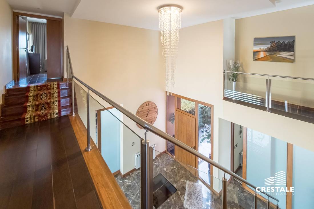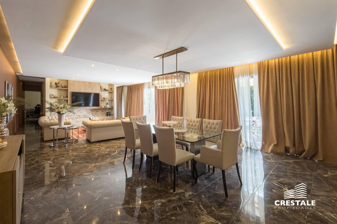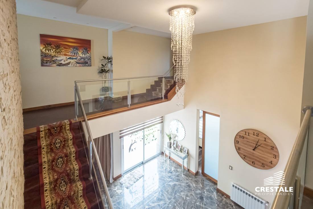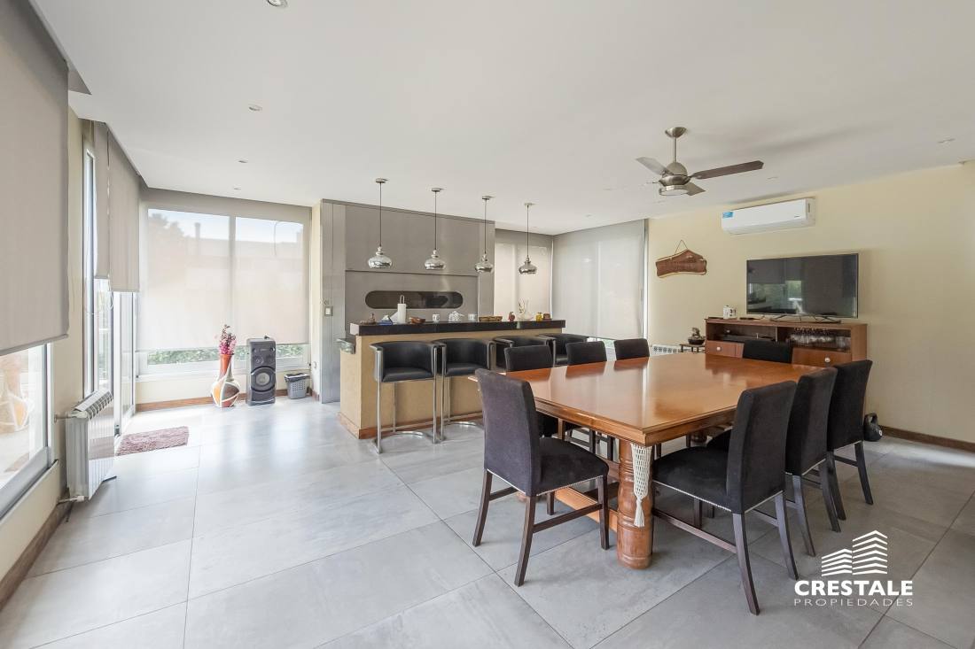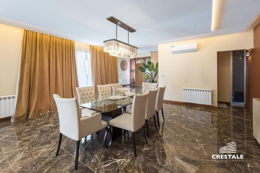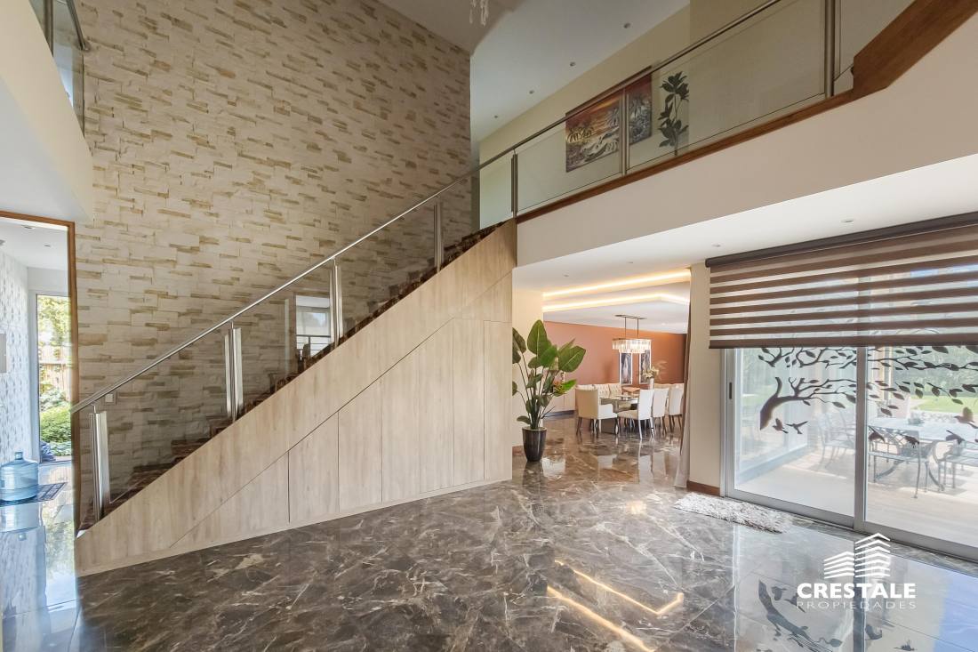 Venta / Permuta - Casa 4 dormitorios con piscina, quincho y subsuelo - Kentucky, Funes Propiedad desarrollada sobre un lote de 1200 m² (25 m de frente por 48 m de fondo), con una superficie cubierta de 458 m², distribuida en tres niveles y orientada al este, lo que favorece la luminosidad natural en los principales ambientes. En planta baja se dispone un amplio estar comedor con grandes ventanales al jardín, generando integración visual y espacial con el exterior. La cocina es independiente, equipada con isla central, mesadas y alzadas en mármol, mobiliario de primera línea Johnson y alacenas con frentes de vidrio, complementada con lavadero independiente. En este nivel también se desarrolla un dormitorio con baño completo y un escritorio, ideal para home office o uso flexible. En planta alta se encuentra la master suite de generosas dimensiones, con vestidor doble, sector íntimo adicional y baño completo con hidromasaje, doble bacha y box de ducha. Los dormitorios secundarios cuentan con excelentes dimensiones, uno de ellos en suite con vestidor, mientras que el restante es asistido por un baño completo. La propiedad incorpora un subsuelo con cava y SUM, ideal para usos recreativos, sociales o de guardado. El sector exterior cuenta con galería semicubierta, quincho independiente de grandes dimensiones con parrillero revestido en acero inoxidable, y piscina equipada con sistema de bomba y filtrado, conformando un espacio ideal para reuniones y esparcimiento. El ingreso vehicular dispone de portón automatizado de PVC, rampa de hormigón y cochera cubierta para dos vehículos. La vivienda se destaca por su calidad constructiva, amplitud y diseño funcional, con calefacción por radiadores en todos los ambientes. Residencia de alta gama en barrio privado Kentucky Club de Campo, uno de los desarrollos más exclusivos de Funes. Ubicado sobre la autopista Rosario–Córdoba, el barrio ofrece rápida conexión con Rosario y cercanía a los principales corredores de la región. Kentucky se caracteriza por su entorno natural, amplios lotes y urbanización de primer nivel, consolidado como uno de los barrios más buscados para vivienda permanente. El desarrollo cuenta con infraestructura deportiva y recreativa, incluyendo canchas de golf, tenis, fútbol y espacios verdes, además de seguridad las 24 horas y accesos controlados, brindando un entorno seguro y de calidad para la vida familiar. Código web: CHO7870382