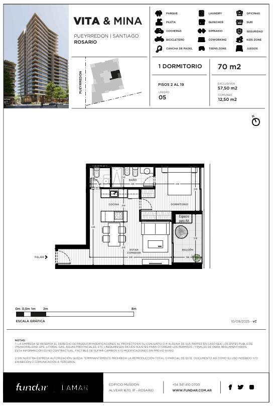 Vita y Mina - Pueyrredón 1141 - Barrio Lourdes. Fundar Construcciones, propone un nuevo estándar de calidad en Barrio Lourdes: dos torres residenciales, oficinas, locales comerciales y un parque central de 3.000 m2 con amplios espacios verdes. Departamento de 1 dormitorio - Tipología 05. Superficie total: 70 m2 - Superficie exclusiva: 57,50 m2. Unidad frente PARQUE INTERIOR. Cocina semi integrada totalmente equipada con horno eléctrico y anafe vitrocerámico, mobiliario bajo mesada y alacenas con mesada de material sintético tipo Silestone o similar. Estar comedor con salida al balcón, toilette de recepción, baño completo y dormitorio con placard con interiores. Calefacción por radiadores, preinstalación para aire acondicionado, y aberturas con doble vidrio hermético (DVH) y persianas automáticas en dormitorios. Amenities: piscina climatizada con solárium, gimnasio, quincho con parrillero, SUM, cancha de pádel, juegos infantiles, coworking, teens zone, kids zone y laundry. Entrega estimada: 42 meses. Financiamiento disponible.