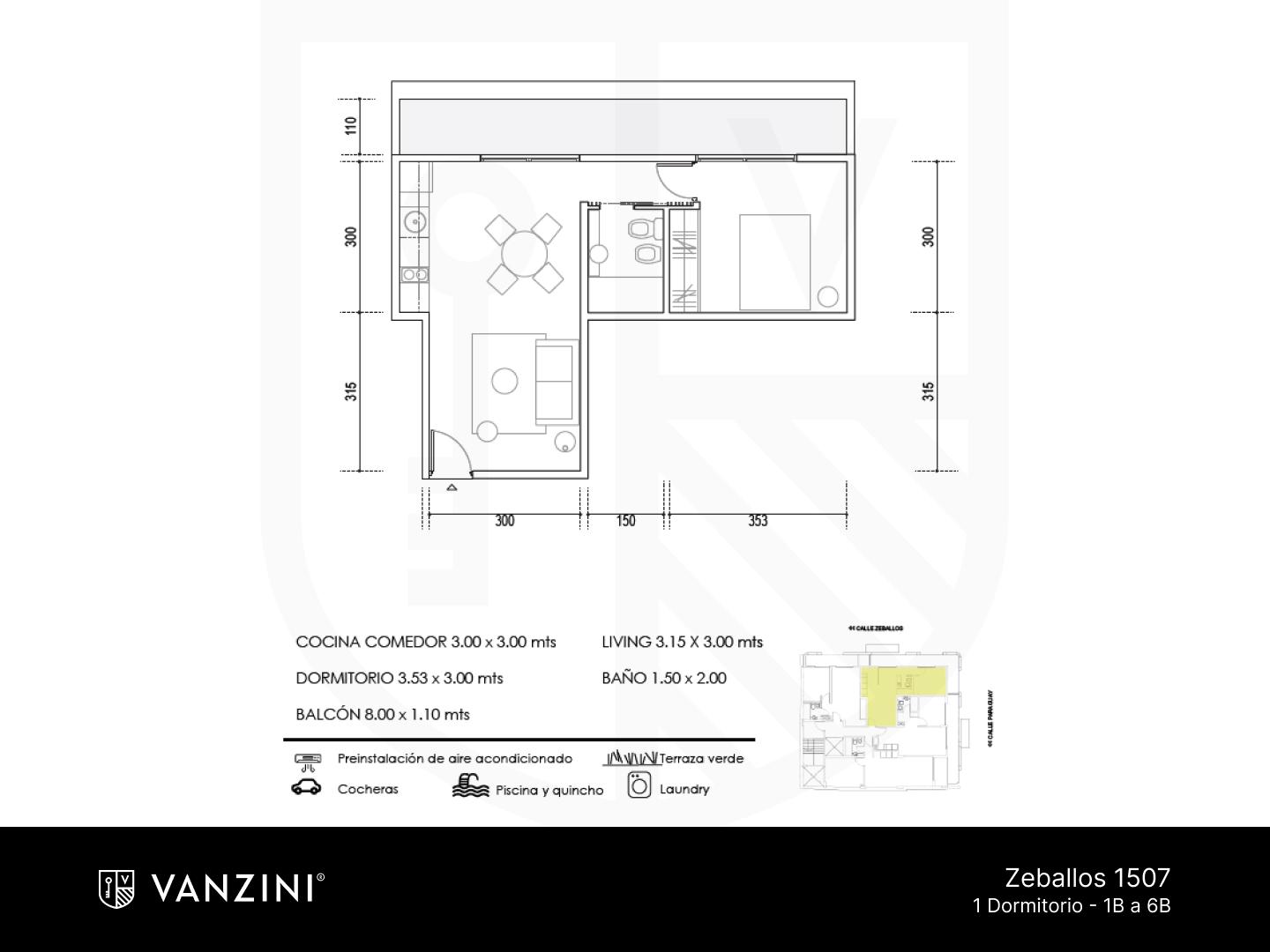 Departamento de 1 dormitorio con balcón al frente. Preinstalación A/A en dormitorios y estar (no incluye equipos; pisos de porcelanato en estar, comedor y cocina; Piso flotante en dormitorios; Revestimiento de porcelanato en baño y cocinas (en alzada mesada bajo alacena); aberturas de primera calidad en aluminio y con DVH; puertas placa de MDF pintado de blanco semimate con marcos de chapa plegada; frente de placares con puertas corredizas en MDF, enchapado en melamina, con guías de aluminio, interiores colocados; cielorrasos en hormigón visto en dormitorios y living; suspendido de durlock en baños y cocinas; baños con artefactos Roca; grifería FV; bañera de chapa enlozada; vanitory con bacha tipo Vessel; equipamiento de cocina completo con bajo mesada y alacenas de melamina de primera calidad; mesada de granito; bacha de acero inoxidable Johnson; grifería Mono comando FV; horno y anafe eléctricos colocados. Agua caliente central. • Proyecto: Edificio de Dinamic con planta baja más 8 pisos, 1 ascensor, control de acceso, bicicleteros, quincho común, solárium y pileta en azotea. • Ubicación: En el centro de la ciudad de Rosario, en la intersección de calle Zeballos y Paraguay. • Observación: Alahajamientos. Opcional de cochera. Posesión diciembre 2026, se vende por adhesión al Fideicomiso. Agua caliente central y departamento 100% eléctrico. NOTA: Las medidas informadas incluyen el 50% de los muros medianeros y el 100% de los muros interiores. Todas las fotos publicadas son propiedad intelectual de Vanzini Black S.A. No es permitida su utilización comercial. Las medidas y superficies expuestas son estimativas y a corroborar con sus respectivos planos y títulos. La publicación de este inmueble es a solo título informativo, la venta de la propiedad está supeditada a que el propietario cumplimente el trámite ante la AFIP para la obtención del Número de COTI correspondiente. La información no es contractual. Si querés saber el valor de tu propiedad, contactate con nosotros y tasamos tu propiedad en 48hs.