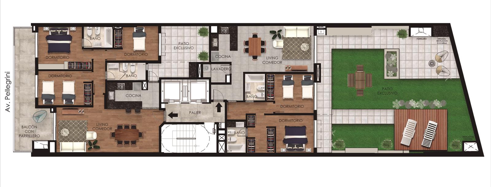 Departamento de 2 dormitorios con amplísimo patio exclusivo Ubicado sobre Av. Pellegrini, una de las principales arterias de la ciudad de Rosario y tradicional corredor gastronómico. Edificio con 13 plantas de uno, dos, tres dormitorios y monoambientes. Dos niveles de cocheras con un enchufe de cargador para auto eléctrico por planta. Sum con expansión, parrillero y amenities. Minipiscina, solárium y gimnasio. Departamento en piso 01 al contrafrente con orientación Norte y enorme patio exclusivo. Ingreso a living-comedor Cocina semi integrada completa Lavadero independiente Dos dormitorios Dos baños (uno en suite) Amplísimo patio al contrafrente con solarium y parrillero Código del inmueble: CBU56863 AP6149507 Encontrá todas nuestras propiedades en: cccarlachiani. com. ar C.I. Mauro Carlachiani Mat. N° 280 *Toda la información y medidas provistas son aproximadas y deberán ratificarse con la documentación pertinente y no compromete contractualmente a nuestra empresa. Los gastos (Expensas, API, TGI, AGUAS, etc.) expresados, refieren a la última información recabada y deberán confirmarse. Fotografías no vinculantes ni contractuales.