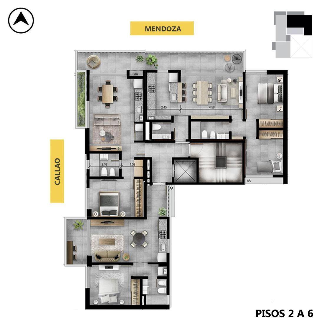 Estar principal con cocina semi separada por barra desayunadora. Amplio balcón al frente sobre calle Mendoza y ventanales sobre Callao. Baño completo. Suite principal con placares y ventilación al frente. Dos dormitorios secundarios con placares y ventanales al Oeste. Escritorio con vista al Este. Ventilación cruzada.Emprendimiento ubicación estratégicamente en la esquina de Mendoza y Callao, a metros de Bv. Oroño y con rápido acceso a los distintos puntos de la ciudad. La construcción contempla distintas tipologías y disposiciones entre las que se encuentran, una planta baja y 10 pisos, con unidades de 1, 2 y 3 dormitorios, un local comercial y cocheras en planta baja. En la azotea dispone de un SUM con parrillero y pileta con vista panorámica. FORMA DE PAGO Contado. Financiación. COCHERA Consultar. AMENITIES Pileta; SUM; Terraza; Parrillero TERMINACIONES DEPARTAMENTO 1 DORMITORIO:; Living-comedor: Puerta placa de ingreso en simple contacto compuesta por dos paneles encolados y prensados al bastidor de manera estabilizada, con relleno de nido de abeja celulósico. Caras laminadas en melanina texturada con terminaciones simil madera tipo roble natural, wengue, nogal, nevada. Manija doble balancín con roseta y bocallave.; Paramentos interiores terminados con yeso monocapa tipo alpress pintado de látex blanco.; Piso porcelanato placas grandes tipo 60x60 y/ó flotante símil madera vinílico con manta 7mm. primera calidad. Zócalos blanco nariz recta primera calidad.; Cielorraso aplicado de yeso sobre losa de hormigón terminado con látex blanco.; Aberturas: Aluminio anodizado natural ó negra marca Aluar tipo Línea A30New ó similar (doble vidrio hermético).; Preinstalación: AA, caja en pared, con alimentación eléctrica, desagüe de unidad interior y caño de cobre para unidad exterior. Pico de Gas para calefactor.; Cocina-lavaderos: Paramentos interiores terminados con yeso monocapa tipo alpress pintado de látex blanco. Sector húmedo paramentos revestidos con porcelanato o cerámico primera calidad.; Piso porcelanato placas grandes tipo 60x60 y/ó flotante símil madera vinílico con manta 7mm. primera calidad.; Zócalos blanco nariz recta primera calidad.; Cielorraso suspendido de placa de roca de yeso pintado de látex blanco.; Aberturas: Aluminio anodizado natural ó negra marca Aluar tipo Línea A30New ó similar (doble vidrio hermético).; Muebles de cocina bajo mesada y alacenas: cajones con correderas telescópicas y puertas, terminación MDF 18 mm. primera calidad.; Mesadas de silestone ó granito negro 2 cm con zócalo.; Bacha de acero inoxidable marca Johnson o similar.; Grifería monocomando marca Hidromet/FV o similar.; Artefactos: Horno para empotrar a gas Longvie o similar.; Anafe sobremesada a gas Longvie o similar 4 hornallas.; Espacio para instalación de purificador. (se entrega artefacto).; Calefón a gas 14l. tipo Longvie o similar primera calidad.; Baños: Piso porcelanato placas grandes tipo 60x60 y/ó flotante símil madera vinílico con manta 7mm. primera calidad.; Revestimiento de porcelanato o cerámico primera calidad.; Cielorraso suspendido de placa de roca de yeso pintado de látex blanco con buña perimetral.; Bacha y vanitory de colgar única pieza primera calidad. Espejo con bastidor.; Artefactos sanitarios: Inodoro y bidé Ferrum modelo Mónaco ó similar. Espacio para ducha.; Accesorios: toallero, portarollo, percheros y jabonera deprimera calidad.; Grifería monocomando Hidromet/FV modelo temple ó similar.; Puerta placa, caras laminadas en melanina texturada con terminaciones simil madera color blanca.; Dormitorios: Piso porcelanato placas grandes tipo 60x60 y/ó flotante símil madera vinílico con manta 7mm. primera calidad.; Zócalos blanco nariz recta primera calidad.; Paramentos interiores terminados con yeso monocapa tipo alpress pintado de látex blanco.; Cielorraso aplicado de yeso sobre losa pintado de látex blanco.; Aberturas: Aluminio anodizado natural ó negra marca Aluar tipo Línea A30New ó similar (doble vidrio hermético).; Puerta placa, caras laminadas en melanina texturada con terminaciones simil madera color blanca.; Placard con frentes corredizos con guía de aluminio y puertas en MDF 18mm laminado en melamina. Interior con cajonera y barral.; Preinstalación AA, caja en pared, con alimentación eléctrica, desagüe de unidad interior y caño de cobre para unidad exterior.; Balcones: Pisos de porcelanato o cerámico primera calidad.; Cielorrasos de hormigón visto con laca protectora.; Baranda metálica ó de vidrio reglamentaria.; Artefactos de iluminación. Nicho para unidad exterior AA con reja de perfiles WPC simil madera.; DEPARTAMENTO 2 DORMITORIOS:; Living-comedor: Puerta placa de ingreso en simple contacto compuesta por dos paneles encolados y prensados al bastidor de manera estabilizada, con relleno de nido de abeja celulósico. Caras laminadas en melanina texturada con terminaciones simil madera tipo roble natural, wengue, nogal, nevada. Manija doble balancín con roseta y bocallave.; Paramentos interiores terminados con yeso monocapa tipo alpress pintado de látex blanco.; Piso porcelanato placas grandes tipo 60x60 y/ó flotante símil madera vinílico con manta 7mm. primera calidad.; Zócalos blanco nariz recta primera calidad.; Cielorraso aplicado de yeso sobre losa de hormigón terminado con látex blanco.; Aberturas: Aluminio anodizado natural ó negra marca Aluar tipo Línea A30New ó similar (doble vidrio hermético).; Preinstalación: AA, caja en pared, con alimentación eléctrica, desagüe de unidad interior y caño de cobre para unidad exterior.; Pico de Gas para calefactor.; Cocina: Paramentos interiores terminados con yeso monocapa tipo alpress pintado de látex blanco. Sector húmedo paramentos revestidos con porcelanato o cerámico primera calidad.; Piso porcelanato placas grandes tipo 60x60 y/ó flotante símil madera vinílico con manta 7mm. primera calidad.; Zócalos blanco nariz re