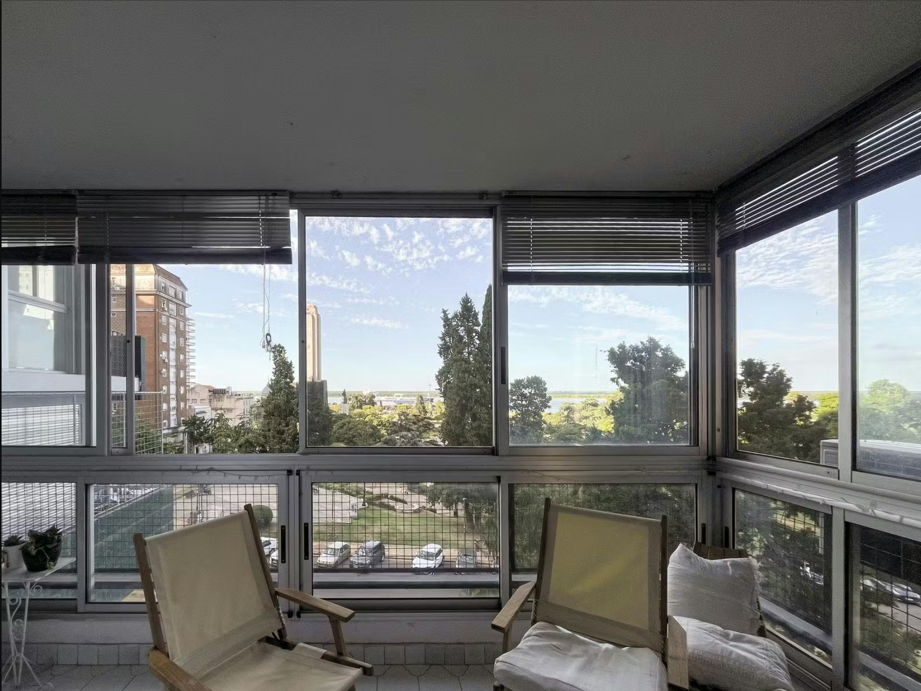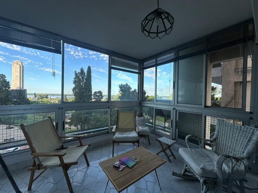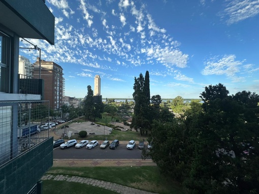 Departamento de 2 dormitorios + comodín, con vista al río. El ingreso principal conduce a un living-comedor amplio, con pisos de cerámico y salida a balcón con vistas despejadas, cerramiento de aluminio y vidrio. Cuenta además con ingreso de servicio hacia una cocina separada, equipada con bajo mesada y alacenas, cocina a gas, mesada de granito y bacha doble de acero inoxidable. Pisos y revestimientos en cerámico y ventilación natural. En este sector se dispone el lavadero y el acceso al comodín, también con ventilación natural, y un baño toilette. Desde el living-comedor se accede a los dormitorios, uno con salida al balcón, piso de madera y placard completo. El departamento posee baño completo, con pisos y revestimientos cerámicos, bacha de cerámica con vanitory y botiquín, bañera y ventilación natural. Las aberturas son de chapa, con persianas enrollables de PVC. Calefacción central con equipo individual en la unidad y agua caliente por calefón a gas. Climatización mediante aires acondicionados individuales.