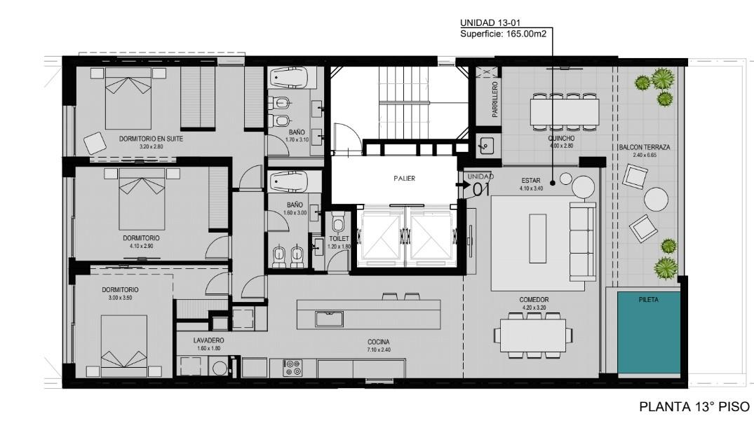 Departamento de 3 dormitorios con terraza, quincho y piscina – En construcción – Rosario, Santa Fe Ubicado en una de las zonas más buscadas de la ciudad de Rosario, este exclusivo departamento combina diseño, confort y ubicación estratégica. A pocos minutos de la costanera, parques, zonas comerciales y con fácil acceso a las principales avenidas, ofrece un entorno ideal tanto para vivir como para invertir. La unidad, situada en el 13° piso, se desarrolla en un solo nivel con una superficie total de 163 m² y una distribución funcional que prioriza la amplitud y la luz natural: Amplio estar comedor integrado a una cocina moderna con barra desayunadora y excelente espacio de guardado. Balcón terraza de generosas dimensiones con área de estar y comedor exterior. Quincho propio con parrillero, ideal para reuniones. Piscina privada con deck para disfrutar del aire libre y las vistas panorámicas de la ciudad. Dormitorio principal con vestidor y baño en suite. Dos dormitorios secundarios con placard. Segundo baño completo y toilette de recepción. Escritorio o espacio de home office. Lavadero independiente. Amenidades exclusivas de la unidad: quincho propio, piscina privada, terraza de uso exclusivo, vestidor y distribución pensada para la comodidad y privacidad. Una oportunidad única para quienes buscan una vivienda de alta categoría en una ubicación privilegiada, con todo el confort de un hogar moderno y espacios diseñados para disfrutar.artamento exclusivo es una oportunidad única para aquellos que buscan un estilo de vida premium en un entorno de excelencia. La unidad se vende con una unidad de cochera en PB. Valor publicado : Pago Contado - Financiado: consulte - Información y medidas provistas aproximadas, las cuales se ratificarán con la documentación pertinente suministrada por organismos públicos. En estos casos, al igual que las fotografías ilustrativas, no comprometen contractualmente a nuestra empresa pues no son vinculantes ni contractuales.