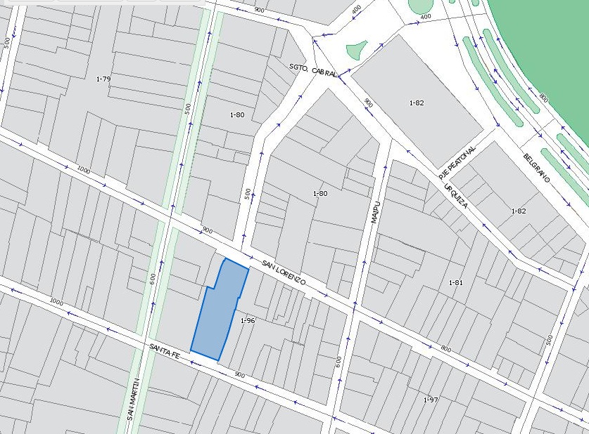 Terreno, Actualmente playa estacionamiento .Secc 1 manz 96 Lote 3 ( Area ARD Autorizacion indicadores urbanisticos a aprobar) las medidas son aproximadas por con alguna irregularidades del trazado del lote . Tiene salida a calle Santa fe con un frente de 22 m. Posibilidad adosar lote 1-8 234,68 m2 mas Frente 77 metros y fondo 21 metros