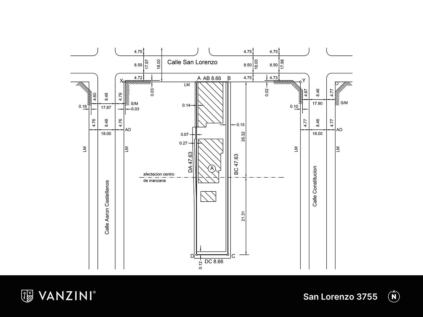 Terreno de 412 m2 con 8.66m de frente por 47.63 de fondo. Fos 0.7 , afectación de centro de manzana a los 26.32m. Altura máxima permitida 14.50m (PB+4 pisos). • Ubicación: En barrio Luis Agote, sobre calle San Lorenzo entre Calles Constitución y Castellanos. A una cuadra del Mercado del Patio, Terminal de ómnibus y en cercanías de Facultades de Medicina, odontología, etc. • Observación: Escriturado. Plano de mensura actualizado NOTA: Las medidas informadas incluyen el 50% de los muros medianeros y el 100% de los muros interiores. Todas las fotos publicadas son propiedad intelectual de Vanzini Black S.A. No es permitida su utilización comercial. Las medidas y superficies expuestas son estimativas y a corroborar con sus respectivos planos y títulos. La publicación de este inmueble es a solo título informativo, la venta de la propiedad está supeditada a que el propietario cumplimente el trámite ante la AFIP para la obtención del Número de COTI correspondiente. La información no es contractual. Si querés saber el valor de tu propiedad, contactate con nosotros y tasamos tu propiedad en 48hs.