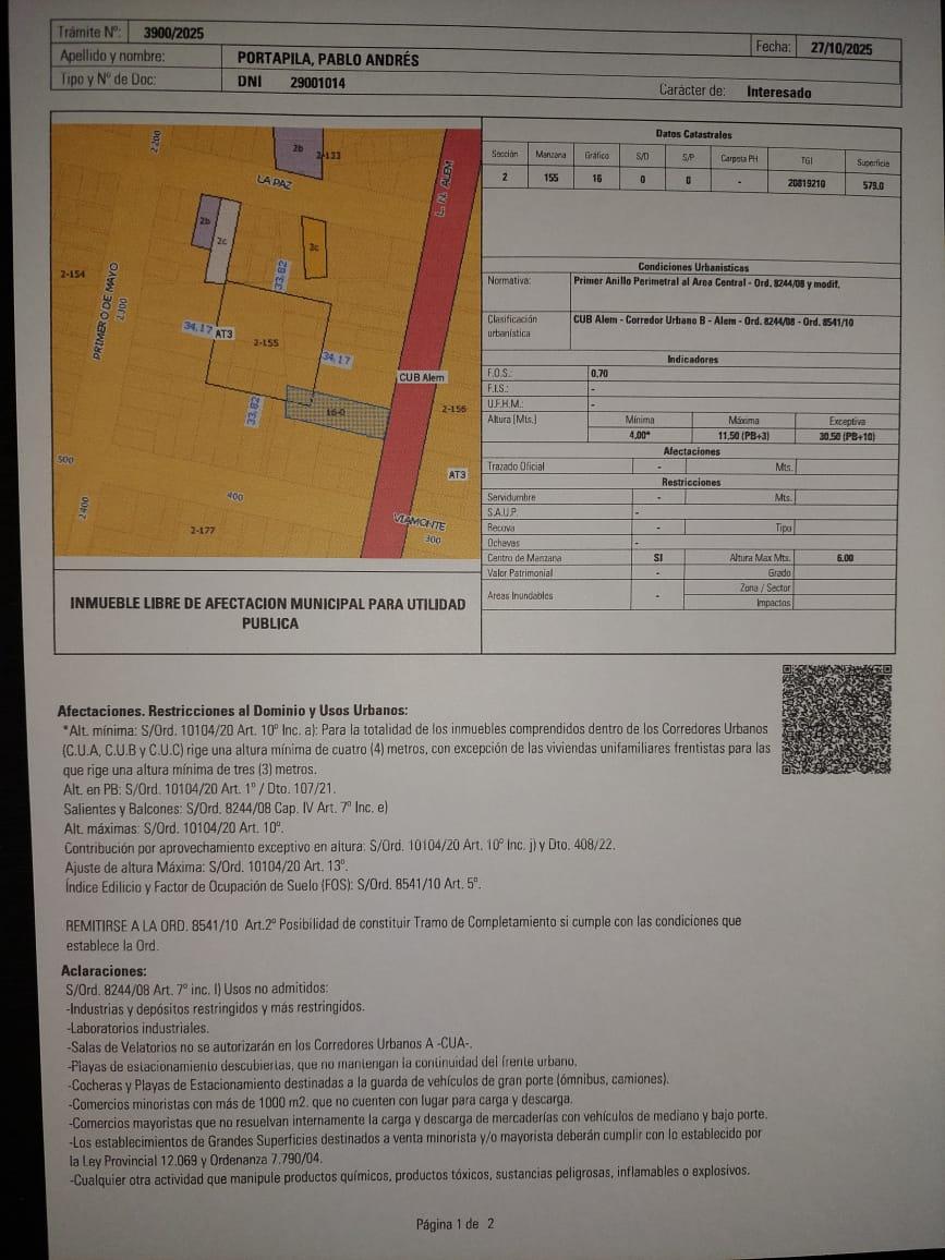UBICACION Sobre calle Alem entre La Paz y Viamonte, a pocos metros de esta última, a 250 mts de Bv. 27 de Febrero.Cuenta también en cercanías con importantes Facultades. CARACTERISTICAS El terreno posee afectaciones por centro de manzana (muy pequeña) y no cuenta con valor patrimonial. Posee orientación este en el frente y oeste al contrafrente, se encuentra dentro de una zona AT-3. En el mismo hay edificado un galpon con unas oficinas comerciales a concluir. El inmueble frentista sobre CUB (corredor urbano B) Excelente lote de terreno, IDEAL PARA CONSTRUCTORAS. Cuenta con un frente de 12,99 mts y un fondo de 45,57 mts, haciendo un total de 592mts2. Se puede construir PB + 10 pisos (con exceptiva). *Posibilidad de recibir inmueble/s en forma de pago hasta un 100%. Contáctanos para coordinar una visita. Código del inmueble: CLA7314432 Encontrá todas nuestras propiedades en: cccarlachiani. com. ar C.I. Mauro Carlachiani Mat. N° 280 *Toda la información y medidas provistas son aproximadas y deberán ratificarse con la documentación pertinente y no compromete contractualmente a nuestra empresa. Los gastos (Expensas, API, TGI, AGUAS, etc.) expresados, refieren a la última información recabada y deberán confirmarse. Fotografías no vinculantes ni contractuales.